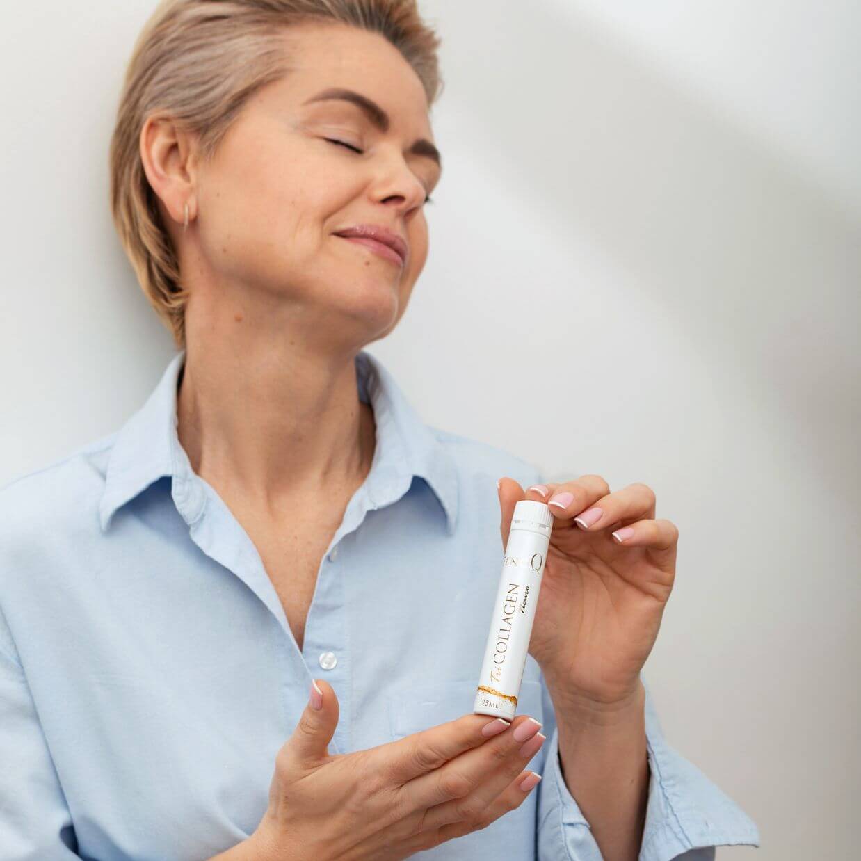 Ingredienser: Renset vann, hydrolysert fiskekollagen, fruktose, konsentrert kirsebærsaft, surhetsregulerende middel sitronsyre, taurin, L-askorbinsyre (vitamin C), glutamin, karnitin, sinkbisglysinat, kirsebærsmak, tørrekstrakt av Panax ginsengrot 4:1, tørrekstrakt av Ginkgo biloba-blader 50:1, tyrosin, arginin, konserveringsmidler kaliumsorbat og natriumbenzoat, glutation, nikotinamid (niacin), DL-alfa-tokoferol (vitamin E), koenzym Q10, kalsium D-pantotenat (pantotensyre), riboflavin (vitamin B2), pyridoksinhydroklorid (vitamin B6), tiaminmononitrat (vitamin B1), retinylacetat (vitamin A), krompikolinat, kolekalsiferol (vitamin D), cyanokobalamin (vitamin B12).